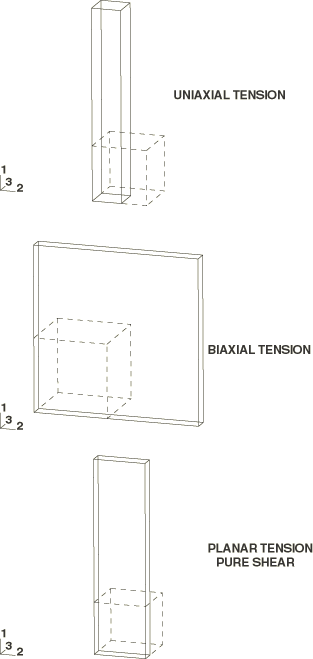 Experimental data of TreloarFor this example experimental test data measured by Treloar (1944) are used. The stress-strain data were measured for 8% sulfur rubber, which exhibits highly reversible behavior. Nevertheless, specimens were conditioned by prestraining to induce any permanent deformation before actual measurements were performed. Some slight hysteresis was observed at higher strains. The hyperelasticity model assumes ideal elasticity. Separate viscoelastic material data can be defined with viscoelastic behavior to model the hysteresis effects. With the assumption of full incompressibility, 1. The deformation modes for the tests described in terms of the principal stretches are: