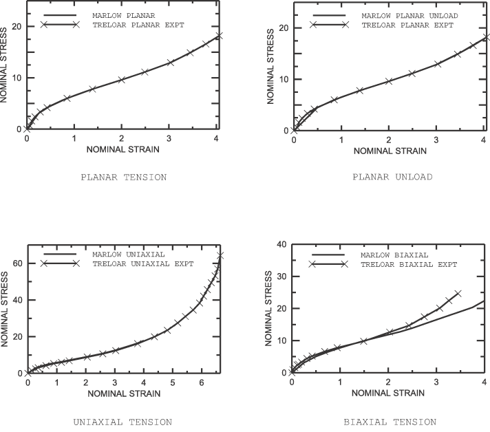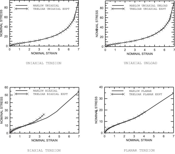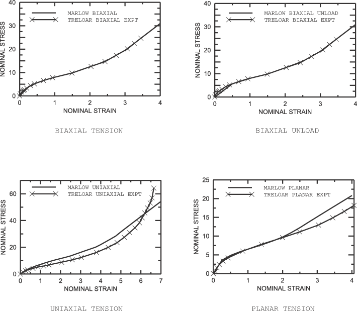 Except for the polynomial model with 1 (both the neo-Hookean and Mooney-Rivlin forms), the uniaxial tension results correlate very closely to the uniaxial test data. This is expected since the hyperelastic constants are fitted using the uniaxial data. However, the (general) polynomial and Ogden models show large differences between the numerical and test data for the equibiaxial tension and planar tension cases. For the case with polynomial 1 (Mooney-Rivlin), instabilities in the equibiaxial and planar tension cases occur immediately. For the case with polynomial 2, the stress increases very rapidly at higher strains. For the Ogden potential the case 3 starts diverging significantly at moderate strains but not as severely as the case of polynomial 2. Notably, the Ogden 2 case still gives reasonably close fits even at higher strains. Experience with additional sets of test data indicates that it may be possible to generalize these observations. By omitting the dependence of the polynomial model on the second invariant, a much better prediction of the unmeasured stress states is obtained. This observation is in agreement with results reported in the literature; see Kaliske and Rothert (1997) or Yeoh (1993). In particular, the neo-Hookean model provides good first-order approximations to all stress states even though the coefficient was measured from only a uniaxial test, whereas in our example the Mooney-Rivlin model is not even able to predict the qualitative tendencies correctly. The Yeoh model (or reduced polynomial, N=3) provides a good third-order approximation for all stress states without exhibiting any instabilities in the present case. Higher-order reduced polynomials, which are more likely to suffer from Drucker instability, are rarely needed, except, for example, when the stress-strain curve is “double-S-shaped.” The best fit to all three deformation modes, when the strain energy potential is derived from uniaxial data, is obtained with the Van der Waals, Arruda-Boyce, and Marlow models. If the test data in the small stretch range were more densely spaced and the S-shape were more pronounced, as is common for filled rubbers, the Van der Waals model is likely to show an even clearer superiority, since the additional parameters create enhanced flexibility in representing complex stress-strain curves. Results and discussionFor Treloar's test data, when taking into account uniaxial, biaxial, and planar test data, the Ogden and Van der Waals forms give a closer fit than the polynomial forms. The Arruda-Boyce and Yeoh forms also provide an accurate representation. The (general) polynomial form exhibits some instabilities for 2 and provides only a first-order approximation for 1. A completely different conclusion is reached when only limited test data are available. In this case the Van der Waals model (with ) and the Arruda-Boyce model are clearly superior to the Ogden model. The polynomial model is significantly enhanced when the dependence on the second invariant is omitted. The Yeoh model gives a very good third-order representation even for the deformation modes that have not been incorporated in the curve fit. Similarly, the neo-Hookean model gives a good first-order approximation for all stress states even when the fit is based on only one deformation state. The high quality of the Ogden fit, as opposed to the (general) polynomial, in the presence of test data for all three deformation modes can be explained by the Ogden potential's flexibility in conforming to test data—the exponents can assume any real values, whereas the polynomial potential can only have integer exponents. However, for accurate analyses with the most general models—Ogden and (general) polynomial—it is important that multiple and independent types of test data be used in fitting the hyperelastic constants if the actual elastomeric model to be analyzed will experience general stress-strain states. In accordance with Yeoh (1993), we suggest that the dependence on the second invariant be omitted when incomplete or limited material data are available; the curve fit for the Van der Waals model should be performed with , and the reduced polynomial form should be preferred over the (general) polynomial model. The Arruda-Boyce model is, by definition, independent of the second invariant. It is not possible to suppress the dependence on the second invariant for the Ogden model. Figure 15 to Figure 17 show the results for the Marlow model using different test data. It can be seen that the model can represent the material's behavior in the deformation mode for which test data are available exactly and have reasonable behavior in other modes of deformation. Other considerations for achieving accurate and stable fits are discussed in Hyperelastic behavior of rubberlike materials. Input files