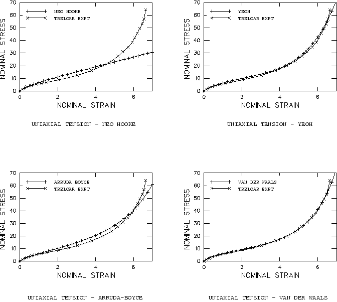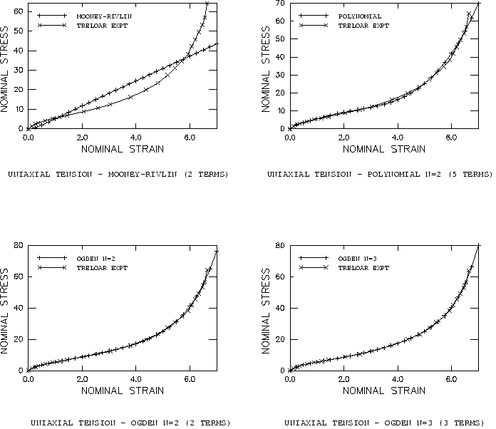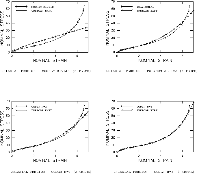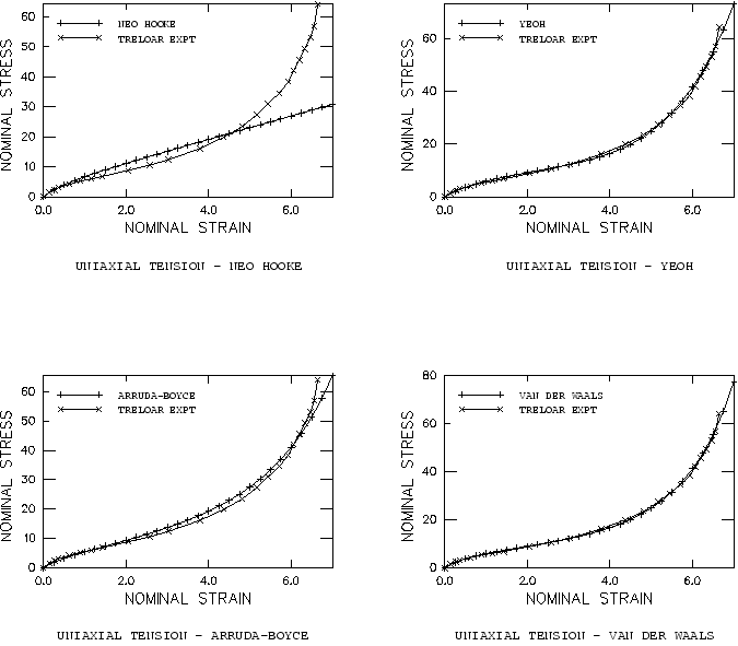 All three types of test data are used simultaneously in fitting the hyperelastic constants. To evaluate the hyperelastic behavior in Abaqus, a single continuum, reduced-integration, hybrid C3D8RH element with unit dimensions is subjected to uniaxial tension, equibiaxial tension, and planar tension. The deformation modes are illustrated in Figure 2. The Abaqus nominal stress–nominal strain results are compared with the test data in Figure 3 to Figure 8. For the polynomial potential the case 1 (Mooney-Rivlin) gives a reasonable fit at low strains but is unable to reproduce the stiffening response of the rubber at higher strains. The case 2 provides the higher-order terms to enable closer correlation to the test data at all strain levels. Similar observations apply to the reduced polynomial with 1 (neo-Hookean) and 3 (Yeoh); the neo-Hookean model offers only a linear dependence of the first invariant and, thus, fails to provide an accurate representation of the upturn. In contrast, the three-term reduced polynomial (Yeoh) provides a more accurate representation than the full polynomial with 2, which has five coefficients. In addition, the Yeoh model does not exhibit any instabilities when fitting the Treloar test data. For the Ogden potential both the cases 2 and 3 give very close fits to all three deformation modes, with the case 3 providing the best correlation among all fits. The Arruda-Boyce model also gives a satisfactory fit. In the uniaxial case the upturn is not as steep as in the experiment; in the middle stretch range the stresses are overestimated. Other curve fits have been reported in the literature; for example, Boyce (1996) reports 0.27 MPa 2.75 kgf/cm2 and 5.15. These differ from our values, 3.28 kgf/cm2 and 5.24. The differences can be attributed to the fact that the relative error in stress is minimized. Another potential source of discrepancies could be different spacing of the Treloar test data. The Van der Waals model gives a better fit than the Arruda-Boyce model, although not as good as the Ogden model. All stretch ranges of the stress-strain curve are fitted with high accuracy. Our fit compares favorably with those reported in the literature (Vilgis and Kilian, 1984); however, we use a more refined model since we take into account a slight dependence on the second invariant. Fitting case 2—using uniaxial tension data onlyCommonly, not all three or even two types of test data are available. Figure 9 to Figure 15 show the consequences of using different hyperelastic forms with only the uniaxial tension data. The following cases are analyzed: