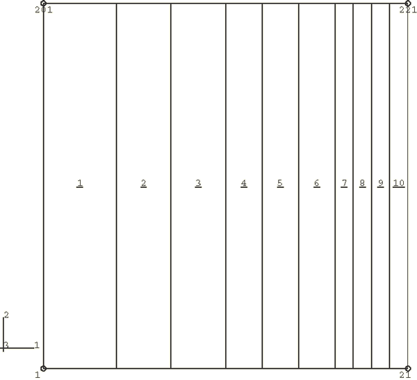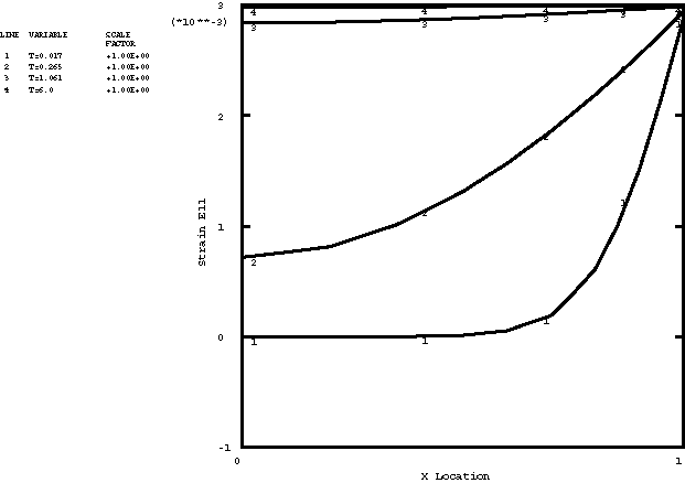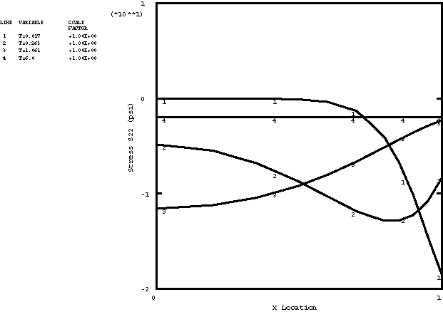 The Abaqus/Standard results are of limited accuracy because of the relatively large time increments used. The stress and strain distributions at various times during the solution are shown in Figure 2 and Figure 3. The final stress in the slab is calculated as −0.0138 MPa (−2 psi), while the final strain is 2.99 × 10−3. Figure 4 shows the time history of the stress at the leftmost and rightmost integration points in the structure. Time histories for the same problem, solved without the temperature-time shift, are also shown in this figure. As expected, the shift considerably shortens the time required for the structure to reach equilibrium. The equilibrium stress and strain distributions obtained from the stress analyses of the viscoelastic slab can be compared with those of an elastic slab whose properties correspond to the long-term properties of the viscoelastic material. The extensional relaxation function for the viscoelastic material is The long-term Young's modulus, , is and is 6.83 MPa (989.99 psi). The long-term Poisson's ratio can be calculated from the long-term Young's modulus and the bulk modulus, The equilibrium values of and are obtained using linear elasticity By symmetry , and by the assumptions of plane strain 0. The slab is unrestrained in the X-direction, so 0. These conditions result in stress and strain distributions that follow the temperature distribution, At steady state the temperature is 100° throughout the slab, so the final stress and strain are which agree with the steady-state values obtained in the analyses. Input filesAbaqus/Standard input files