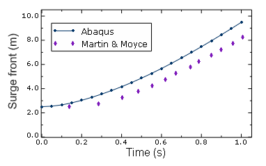 ProductsAbaqus/ExplicitAbaqus/CAE Problem descriptionThe model is created in Abaqus/CAE using a simple rectangular Eulerian domain measuring 10 × 5 × 0.05 m. Because Eulerian analyses must be conducted in three-dimensional space, it is common to approximate two-dimensional problems using a thin domain with a single Eulerian element through its thickness. Cubic elements provide the best accuracy and performance in Eulerian analyses, so the thickness is chosen to correspond to the height and width of each element in the eventual mesh. Zero-velocity boundary conditions normal to all the domain faces prevent the flow of material into or out of the domain. The domain is partitioned, and the Eulerian material (water) is assigned to a 2.25 × 4.5 m region along the left edge of the domain (see Figure 1). The water is modeled as a nearly incompressible, viscous Newtonian fluid. The linear Hugoniot form of the Mie-Grüneisen equation of state is used in the material model. The parameters used to define the material, based on a bulk modulus of approximately 2.246 GPa, are listed in Table 1. In addition to a gravity load applied to the entire Eulerian domain, initial geostatic stresses are defined in the water to model the hydrostatic pressure in the column. Since geostatic stresses cannot be defined directly in Abaqus/CAE, they are added to the model using the Keywords Editor. The Eulerian domain is finely meshed with a grid of 222 × 111 Eulerian EC3D8R elements. Results and discussionIn the Visualization module of Abaqus/CAE, an isosurface view cut based on the Eulerian volume fraction for water (output variable EVF_WATER) is used to visualize the progression of the column collapse within the Eulerian mesh, as shown in Figure 2. The results can be compared to experimental data from a similar physical model by Martin and Moyce (1952). The trends of the surge front in the experimental case and in the Abaqus case are similar (see Figure 3). Given the potential inaccuracies associated with the experimental measurement techniques, as documented by Martin and Moyce, the two cases agree reasonably well. The surge front can be tracked in the Visualization module of Abaqus/CAE by investigating the Eulerian volume fraction for water in the elements along the bottom of the mesh. The tracking can be done manually or by creating X–Y data objects from output variable EVF_WATER and using mathematical operations to convert the volume fraction to an associated distance. Figure 4 illustrates the dynamics of the water by contouring the velocity in the horizontal direction (V1) and the velocity in the vertical direction (V3) during the collapse. The water in the column moves downward under the gravity load (with the free edge of the column falling faster than the edge along the wall), forcing an accelerating surge in the horizontal direction. References