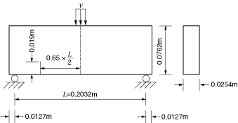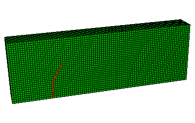ProductsAbaqus/Standard Problem descriptionA beam with an offset edge crack is studied. The specimen, shown in Figure 1, has a length of 0.2286 m, a thickness of 0.0254 m, and a width of 0.0762 m. The distance between supports is 0.2032 m. To induce a mixed-mode fracture, an initial crack with a length of 0.019 m is made at an offset distance of 0.06604 m measured from the midspan in the specimen. A velocity boundary condition is imposed at the midspan of the specimen to simulate a dynamic impact: where = 0.06 m/s and = 1.96 × 10–4 s. The material data for the bulk material properties in the enriched elements are = 31.37 GPa, = 2400 kg/m3, and = 0.2. The response of cohesive behavior in the enriched elements in the model is specified. The maximum principal stress failure criterion is selected for damage initiation, and an energy-based damage evolution law based on a power law fracture criterion is selected for damage propagation. The relevant material data are as follows: = 10.45 MPa, = 19.58 N/m, = 19.58 N/m, = 19.58 N/m, = 1.0, = 1.0, and = 1.0. Results and discussionFigure 2 shows the crack profile when = 1.3 × 10–3 s. The crack propagates at an angle of 58°, which is in reasonable agreement with the experimental result of 60°. Input files