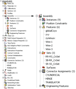 The Model Tree, shown in Figure 1, is helpful for understanding the organization of the reference points, datum coordinate systems, and wire features that you created in assembly-related modules, as well as connector sections and connector section assignments that you created in the Interaction module. You can use the Query toolset in the Interaction module to obtain connector assignment information for selected wires. Figure 1. Wire features, connector sections, and connector section assignments in the Model Tree.