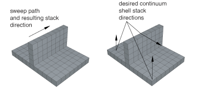 When you are generating elements that will be assigned to continuum shell elements, the elements in the mesh must be oriented consistently. For example, Figure 1 shows a swept mesh generated in the direction of the sweep path. The generated elements are stacked in the direction of the sweep path; however, if you plan to use continuum shell elements, the elements should be stacked through their thickness. Figure 1. The resulting stack direction is not correct for continuum shell elements.