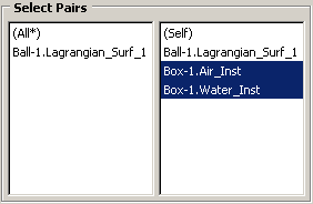 In Abaqus/CAE you can use the global All* with self contact domain to enforce contact between all Lagrangian parts and all Eulerian material instances in the model. Alternatively, you can include or exclude contact between a Lagrangian surface and a particular Eulerian material instance. Eulerian material instances appear in the list of surfaces in the Include Pairs and Exclude Pairs dialog boxes, as shown in Figure 1. You can also assign unique contact properties between particular Lagrangian surfaces and particular Eulerian material instances in the Individual Contact Property Assignments dialog boxes. Figure 1. Eulerian material instances in the Edit Excluded Pairs dialog box.