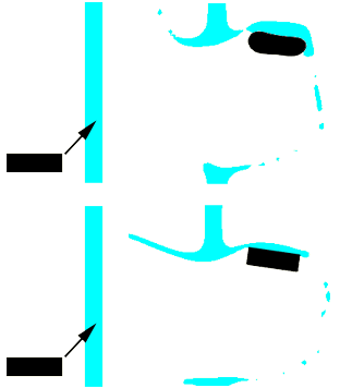 Figure 1 compares a pure Eulerian analysis (top) and a coupled Eulerian-Lagrangian analysis (bottom) of a steel brick passing through a column of water. Figure 1. Comparison of a pure Eulerian analysis (top) and a coupled