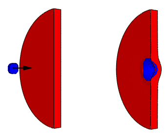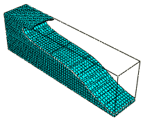 For example, Figure 4 depicts an Eulerian model of a lead projectile impacting a brass plate. The void regions of the Eulerian part are cut away. A two-interval contour plot is applied, rendering the brass in one color and the lead (i.e., not brass) in another color. The resulting plot offers a useful generalization of the deformed shape of the projectile and plate.