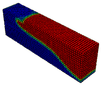 For elements that are partially filled or filled with multiple materials, Abaqus estimates a simple boundary between materials by interpolating the EVF values in adjacent elements. These simple boundaries may be slightly discontinuous across elements. To improve display of Eulerian materials, you should instruct Abaqus/CAE either to use a results averaging threshold of 100% or to compute scalars after averaging results; Abaqus/CAE remaps the material boundaries so they appear smooth and continuous across elements. For more information about results averaging, see Controlling result averaging; for a more detailed discussion of how Abaqus calculates Eulerian material boundaries, see Material interfaces.