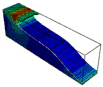 In an Eulerian part that includes three material instances, you can use a combination of view cuts and contour plots to distinguish material instances in the undeformed and deformed model states. First, use an isosurface view cut to remove one of the material instances from the display, as discussed above. Then, create a contour plot of output variable EVF for one of the remaining material instances. The resulting colors in the model distinguish one material from the other. To produce a more defined boundary between the materials, you can reduce the number of contour intervals to two.
