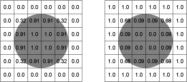 Figure 2. Discrete fields representing volume fractions inside (left) and outside (right) of the shaded reference region.