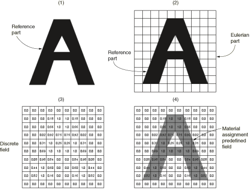 The discrete field that is created by the volume fraction tool can be used to assign material instances to the Eulerian part instance (see Assigning materials to Eulerian part instances). The topology of the assigned Eulerian material instance corresponds to the shape of the reference part instance within the Eulerian part instance.
