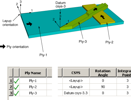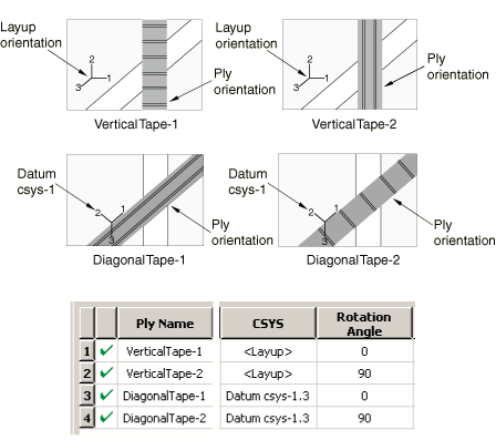 Figure 3 shows the orientation of four plies in a composite layup and the corresponding entries in the layup table.