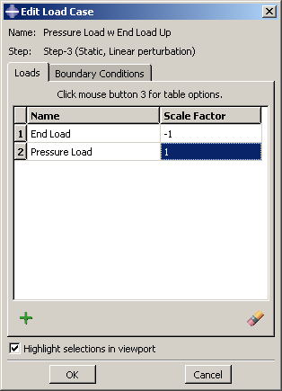 ![]() An encastre boundary condition is applied in the initial step, and the end load and pressure load are applied in a static, linear perturbation step. You can create a load case that contains only the end load and another that contains only the pressure load. In addition, you can create a load case that contains both the pressure load and the end load with the end load applied in the opposite direction (scale factor value of −1), as shown in Figure 2. Figure 2. Load case definition that includes loads for the cantilever beam model.