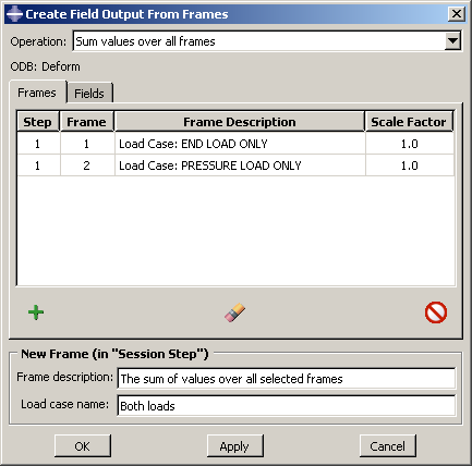 ![]() In the Visualization module you can linearly combine output from several load cases to represent an actual loading environment. You can also obtain the minimum or maximum value of a selected field variable over some or all load cases. For example, you can combine the output from the End Load Only and Pressure Load Only load cases for the cantilever beam model to create new field output with a load case name of Both loads, as shown in Figure 2. Figure 2. Creating new field output by combining the output from two load cases (frames).