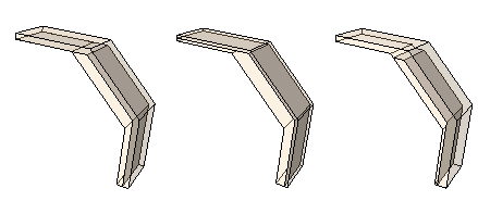 Once you have selected the faces to offset, you can enter a value for the offset distance or select a set of target faces that represents the distance through the desired shell thickness and have Abaqus/CAE calculate an offset. Abaqus/CAE calculates the distance between faces being offset and the target faces. You can offset to half the average distance or a fraction of the distance to the closest or farthest point on the target faces. The difference in using each of the calculated offset distances is shown in Figure 1. The part has three different thicknesses. The thinnest face is at the top, the thickest in the middle, and the vertical face on the right has a thickness between the other two. The three outer faces of the reference representation were selected to be offset, and the three inner faces are the target faces. The view on the left shows the default Half the average distance method, and the offset is approximately the full thickness of the top face. The middle view shows the Fraction distance to closest point on face method with the fractional distance set to 0.5. The top target face is closest to the top offset face, so Abaqus/CAE offsets the new faces by 0.5 times this distance. The view on the right shows the Fraction distance to farthest point on face method with the fractional distance again set to 0.5. The middle (angled) target face is farthest from the middle offset face, so Abaqus/CAE offsets the new faces by 0.5 times this distance—notice that the top offset face is cut off where it would extend through the reference representation of the original solid part because the Auto trim to reference representation option was used. Figure 1. Differences in the offset distance based on the three target face calculation methods.