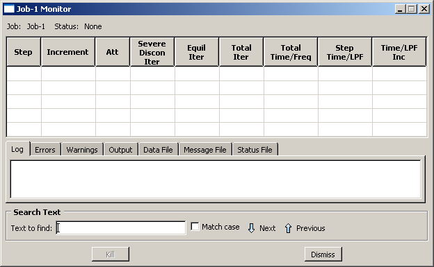 For detailed information on the different output files that Abaqus creates during an analysis, see About Output. You can search for specific error or warning messages within any of the files displayed in tabbed pages in the job monitor. Select the desired file tab, enter a search string in the Text to find field, and click Next or Previous to step through the file from one hit to the next. Toggle on Match case to perform a case-sensitive search. The information presented in the job monitor dialog box is updated continually as the analysis progresses. If the job fails, the Errors tabbed page appears in front of the other tabbed pages automatically to help you determine the cause of the failure. In addition, an exclamation point appears on the tab if any error or warning messages are output. If you start monitoring a job and then exit Abaqus/CAE, close the current model database, or open a new model database, Abaqus/CAE will stop updating the job monitor. The job will continue to run; however, the job monitor will not report the status of the job or update the increment information. If you requested DOF Monitor output on a particular degree of freedom for a particular node, Abaqus/CAE provides another opportunity to monitor the job by plotting the values of the degree of freedom over time. The plot appears in a new viewport that is generated automatically when you submit the job. If the visible part of the canvas is already filled with one or more viewports, the new viewport may be placed on a part of the canvas that is not visible; in this case you should tile or cascade the viewports or enlarge the canvas to bring the viewport into view. (For information on requesting output for a particular degree of freedom for a particular node, see Degree of freedom monitor requests.) If necessary, you can terminate the analysis job by clicking Kill at the bottom of the job monitor dialog box. |
