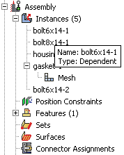 You can use the Model Tree to determine if an instance is dependent or independent. When you mesh an independent part instance, the mesh appears in the Model Tree under the part instance container, as shown in Figure 1. In addition, Figure 1 also illustrates that as you move the cursor over an instance, the information displayed by the Model Tree indicates whether the instance is dependent or independent.