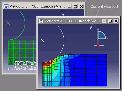 All viewports are associated with a certain model and module. When you create a new model or open an existing model or output database, that model becomes associated with the current viewport. You can create different viewports and associate each one with a different model, so designating each viewport as current results in switching between the associated models. Similarly, you can work in multiple modules simultaneously by designating a new viewport as current before entering a different module.