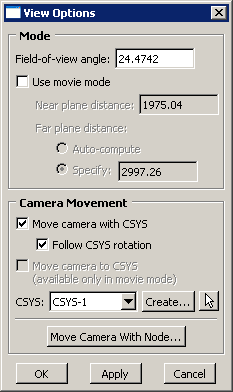This option is available only when Use movie mode and Move camera with CSYS are toggled on. Use movie mode allows the camera to move into and through the model instead of viewing the model from a distance (for more information, see Camera modes and view terminology). When you apply Move camera to CSYS, the camera moves to the origin of the selected coordinate system. Abaqus/CAE toggles this option off immediately after you click Apply in the View Options dialog box to avoid conflicts with the view manipulation tools, some of which also reposition the camera.