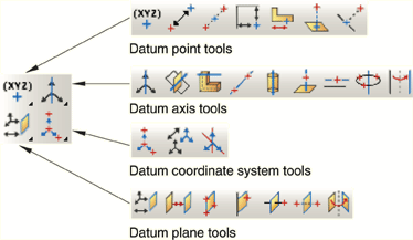 Select Create Datum dialog box, and choose the type of datum to create—point, axis, plane, or coordinate system (CSYS)—from the Type options at the top of the dialog box. The Method list changes to reflect the datum you create. Select the desired datum tool from the Method list, and follow the prompts in the prompt area to create the datum. from the main menu bar to display theYou can also access the Datum toolset from the module toolbox; Figure 1 shows the hidden icons for all the datum tools in the module toolboxes. Figure 1. The datum tools.