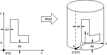 The wrapping procedure will relocate a node at point (, ) on the planar mesh to (), where is the specified radius, = , and =, as shown in Figure 1. A point on the planar orphan mesh located at (0, 0) is mapped to location (, 0, 0) on the cylindrical surface. Figure 1. Wrapping a planar orphan mesh.