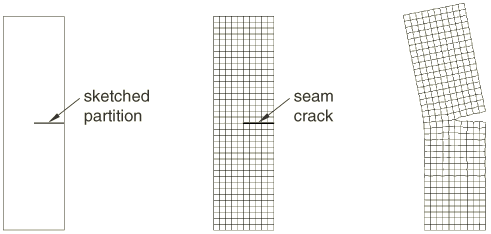 Figure 1 shows a seam on the face of a planar part and the effect of applying a tensile load to the model. The duplicate nodes along the seam are independent of each other and are free to move. Figure 1. A seam embedded in a face.
