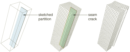 ![]() Figure 2 shows a similar analysis of a seam embedded in a solid part. The seam was created by partitioning the solid with a sketch drawn on a datum plane. Figure 2. A seam embedded in a cell.