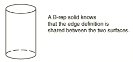 More recently, solid modelers have introduced the concept of a boundary representation, or B-rep, to define a solid object. A B-rep solid is similar to a solid defined by a set of trimmed surfaces; however, a B-rep solid includes additional information about the faces, edges, and vertices that are generated when the surfaces intersect to form the solid. Abaqus/CAE uses ACIS to store geometric entities, and ACIS uses the concept of B-reps. Figure 4 illustrates the cylinder defined as a B-rep solid.