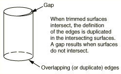 The edges of the solid are well defined when the intersecting surfaces are planar, cylindrical, or spherical. However, when more complex curves intersect, the resulting edge must be described by a polynomial expression that approximates the intersection of the two faces. The accuracy of the approximation depends on the order of the polynomial expression. If an edge does not lie on either surface, a gap is created and the solid is considered invalid. Figure 3 illustrates a gap between trimmed surfaces.