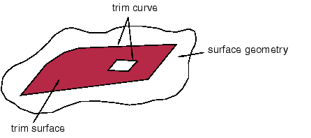 A trimmed surface is defined by a combination of surface geometry and trim curves. The surface geometry is a general expression for the surface; the trim curves form a closed loop on the surface geometry and define the boundary of the surface. A surface can also have multiple internal trim curve surfaces. A solid is defined as a set of trimmed surfaces that form an enclosed volume.