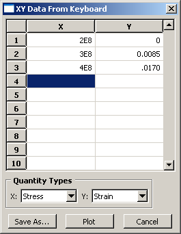 While you are creating a material in the Property module, you can use the data in a table to create X–Y data. You can then use the Visualization module to plot the X–Y data and to visually check its validity. To create an X–Y data object, click mouse button 3 while holding the cursor over the table; then select from the menu that appears. The Create XY Data dialog box appears. In this dialog box, do the following: