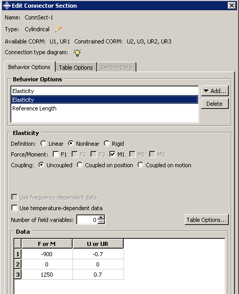 The connector section editor allows you to add the connector behaviors available in Abaqus/Standard and Abaqus/Explicit. When you click on the Behavior Options tabbed page, a list of behaviors appears. After you select a behavior, the name of the behavior appears in the Behavior Options list at the top of the editor, and the behavior becomes part of your connector section definition. The option definition area in the lower half of the editor changes to provide fields in which you can specify information for the currently selected behavior. If you want to remove a behavior from a connector section definition, you can select it from the Behavior Options list and then click . Note: Abaqus/CAE does not perform any checks for dependencies on other behaviors; you should ensure that all required behaviors are defined. For example, if you define a plasticity behavior, you must also define an elasticity behavior. You can define multiple behaviors of the same type, such as elasticity. Only forces or moments that are consistent with the available components of relative motion for the chosen connection type can be selected to define behaviors. For example, the Behavior Options list in Figure 1 reflects that two behaviors and a behavior have been included in the connector section definition. The highlighted behavior defines elastic behavior in the same direction as the selected moment. Figure 1. The connector section editor.