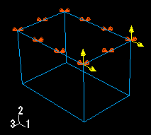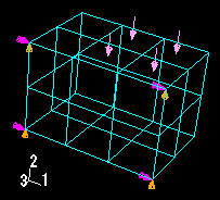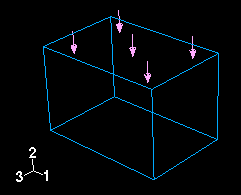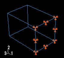 ![]() Note: If you apply a pressure load to a planar geometry face where the surface area is small compared to the enclosed area (such as a ring formed by two concentric circles), the load symbols may not be distributed evenly, regardless of the symbol density settings in the Assembly Display Options dialog box. When a boundary condition fixes a degree of freedom in place, the arrow representing that component points into the region and lacks a stem. For example, the boundary condition in Figure 3 fixes degrees of freedom 1, 2, and 3 in place. Figure 3. A boundary condition fixing degrees of freedom in place.