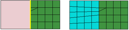 Figure 1 shows an example of the use of mesh-geometry association between an two-dimensional orphan element region and an adjoining geometric region. Associating the geometric edge—the yellow line in the left image—between the two regions with the orphan element edges and nodes results in a compatible hybrid mesh. Figure 1. Associating an edge enforces creation of a compatible mesh.