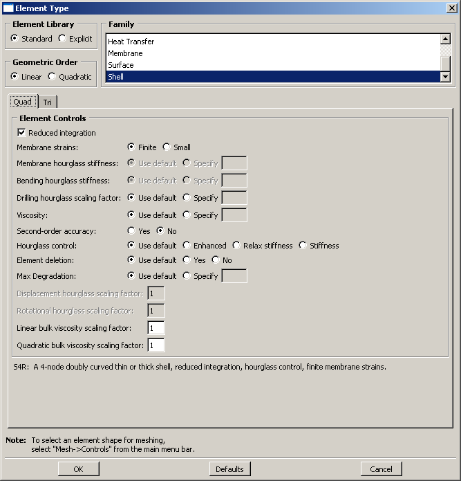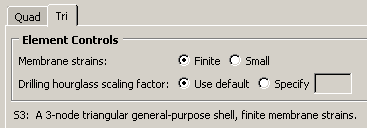 For example, in Figure 1 the options for a linear shell element from the Abaqus/Standard element library are selected. After clicking the Quad tab, reduced integration and finite membrane strains are selected. The name and a brief description of the quadrilateral shell element that meets all of these criteria appear at the bottom of the tabbed page. The Tri tab in this dialog box is shown in Figure 2. The name and a brief description of the triangular shell element that meets all of the criteria specified in the dialog box appear at the bottom of the Tri tabbed page in Figure 2. If the selected region in this example happens to contain a combination of triangular and quadrilateral mesh elements: