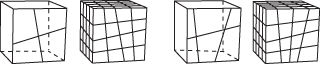 If the region is a cube, a side can be a connected set of faces that are on the same geometric surface. However, each face must have four sides. In addition, the pattern of the faces must allow rows and columns of hexahedral elements to be created in a regular grid pattern along that entire side when the cube is meshed. For example, Figure 8 shows two acceptable face patterns and the resulting regular grid pattern of elements created by meshing the cubes using the structured meshing technique.