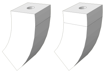 ![]() If one of the connecting sides that connect the source face to the target face in a revolved region is separated into multiple faces due to the internal edge or edges that constrain the mesh, the generated elements are likely to be too distorted to be used as cylindrical elements. You must partition the solid region into simpler revolved regions, as shown in the example on the right side of Figure 3. Figure 3. A solid region that is unsuitable for meshing with cylindrical elements (left) and the same region rendered suitable for meshing with cylindrical elements through the use of a partition (right).