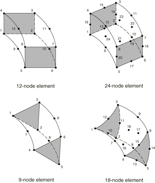 ![]() When you edit a mesh part by assigning cylindrical elements to it, Abaqus/CAE considers Face 1 and Face 2 of each cylindrical element to be the faces along its radial planes. Figure 4 indicates the location of these faces for several types of cylindrical elements. You should orient the stack direction for elements in your part before assigning a cylindrical element type to it; for more information, see the descriptions in Orienting the stack direction. Figure 4. Illustration of node ordering and face numbering for cylindrical elements (with Faces 1 and 2 shaded).