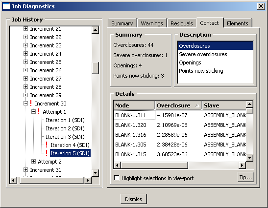 For an Abaqus/Standard analysis, diagnostic information is available for the job and for each step, increment, attempt, and iteration. Figure 1 shows contact diagnostics for an Abaqus/Standard analysis iteration. You can choose the type of contact information that you want to view, and you can select a column to sort the table data. Figure 1. The Job Diagnostics dialog box.