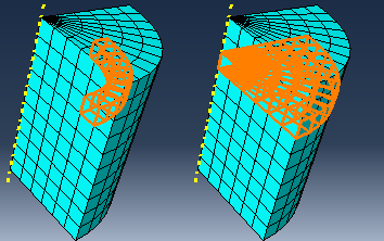 ![]() The angle and feature edge selection methods are described in Using the angle and feature edge method to select multiple objects. The topology method is available during most procedures that select elements. If a procedure accepts object types other than elements, you can change the object type in the Selection toolbar to Elements to access the topology method. The topology method is designed for use with two- and three-dimensional structured meshes. Select an element face from the mesh, and Abaqus/CAE selects all the elements connected to it in a row through the mesh. Select an element edge from the mesh, and Abaqus/CAE selects all the elements in a layer starting with the element faces that share the selected edge. Figure 2 shows selection of an interior row on the left and an interior layer on the right. Figure 2. Using the topology method to select a row or a layer of elements.