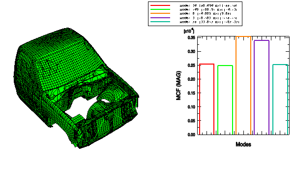 ![]() The plug-in creates each type of plot in a separate viewport and names the viewport accordingly. As a result, you can select Coupled acoustic-structural analysis of a pick-up truck. The variable selected was POR, and the bar graph, polar graph, and vector graph and the ranks were generated for a frequency of 35 Hz. The analysis examined the first five ranked modes (out of 180): from the main menu bar to view all the plots at the same time. The following figures were created by the plug-in using the output database generated by a modified version ofFigure 4 shows the model that was analyzed. The bar graph indicates that Mode 36 is the significant mode at this frequency. Figure 4. Bar graph of MCF for the coupled acoustic-structural analysis of a pick-up truck.