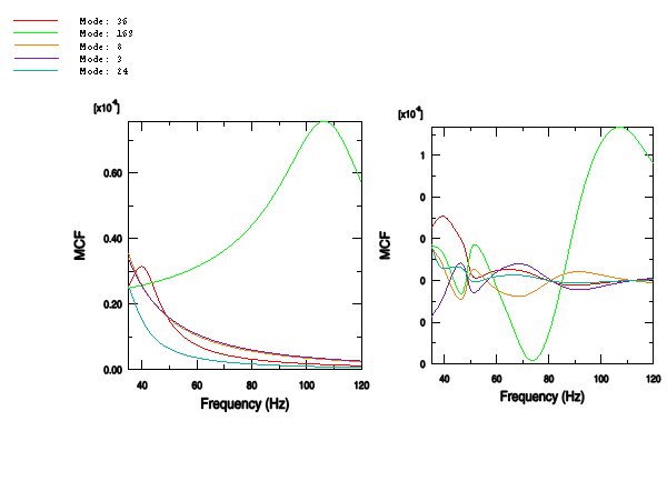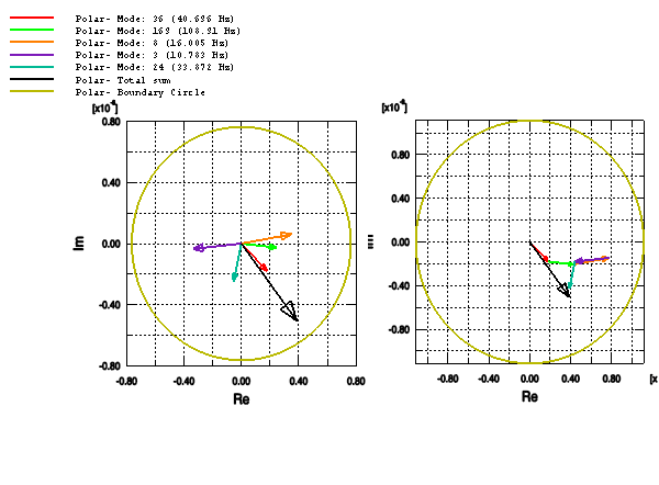 ![]() Figure 6 shows the polar graph and the vector graph. The bar graph shows that the magnitude of mode 36 is less than the magnitude of mode 8; however, the polar plot shows that mode 36 is more in phase with the total response (the vector sum of all the modal contributions). As a result, mode 36 contributes more to the total magnitude than mode 8 at 35 Hz and consequently ranks higher. Figure 6. Polar and vector graphs of MCF for the coupled acoustic-structural analysis of a pick-up truck.
