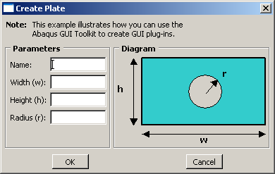 ![]() When the user clicks the OK button to close the dialog box, the GUI plug-in constructs a command that is sent to the kernel for execution. The kernel function builds a part using the dimensions entered in the dialog box. A GUI plug-in is similar to a kernel plug-in in that you must register it with the Plug-in toolset before you can execute it from the menu in the Abaqus/CAE main menu bar. |