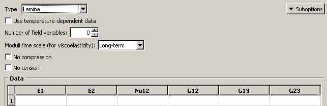 ![]() Different fields become available depending upon how you have set the parameters. For example, when you choose lamina elasticity rather than isotropic elasticity, the table in Figure 3 appears. Figure 3. The lamina elasticity table.