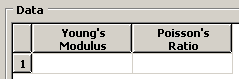![]() A table containing fields for the remaining required material data appears beneath the parameter area; for example, Figure 2 shows the table that appears when you choose isotropic elasticity. Figure 2. The isotropic elasticity table.