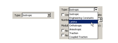 Depending on your analysis requirements, you choose to either accept or change the default parameter values; for example, you choose whether to use isotropic elasticity by using the Type combo box on the elasticity form, as shown in Figure 1. Figure 1. The Type combo box.