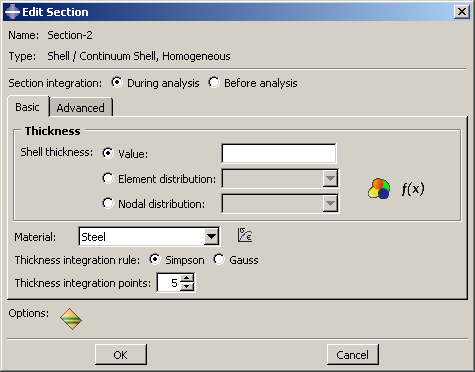 To create a section, select Create Section dialog box appears in which you can name the section and specify the type of section that you want to create. Once you have specified a section name and type, click in the Create Section dialog box to display the section editor, which allows you to create and edit sections. from the main menu bar. AThe format of the section editor varies according to the type of section you are defining. For example, the homogeneous shell section editor is shown in Figure 1. Figure 1. The homogeneous shell section editor.