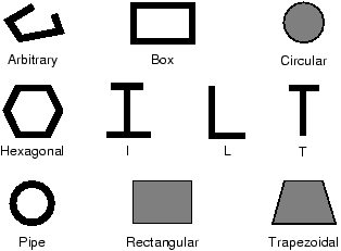 You can create this type of profile by first selecting from a list of shape options and then specifying that particular shape's dimensions. For example, if you select a box shape, you must then specify the height and width of the box as well as the thickness of the four walls. You can select from the following shape options: