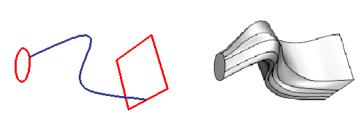 If you choose Select path, you can select from existing edges to define a loft path. This method also allows you to define multiple loft paths. The loft feature is created by following the loft paths as they connect one loft section to the next, as shown in Figure 2. A loft feature with a single selected path behaves similarly to a swept feature except that the cross-section of the loft is constantly changing to match the position and shape of the next loft section along the path.