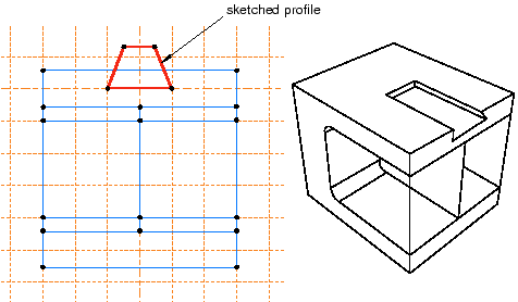 A blind cut is cut into the top of the clamp. The user sketched a two-dimensional profile, and the profile was extruded into the clamp through a specified distance, as shown in Figure 5. The sketch and the depth of the slot are the modifiable parameters that define the blind cut feature.